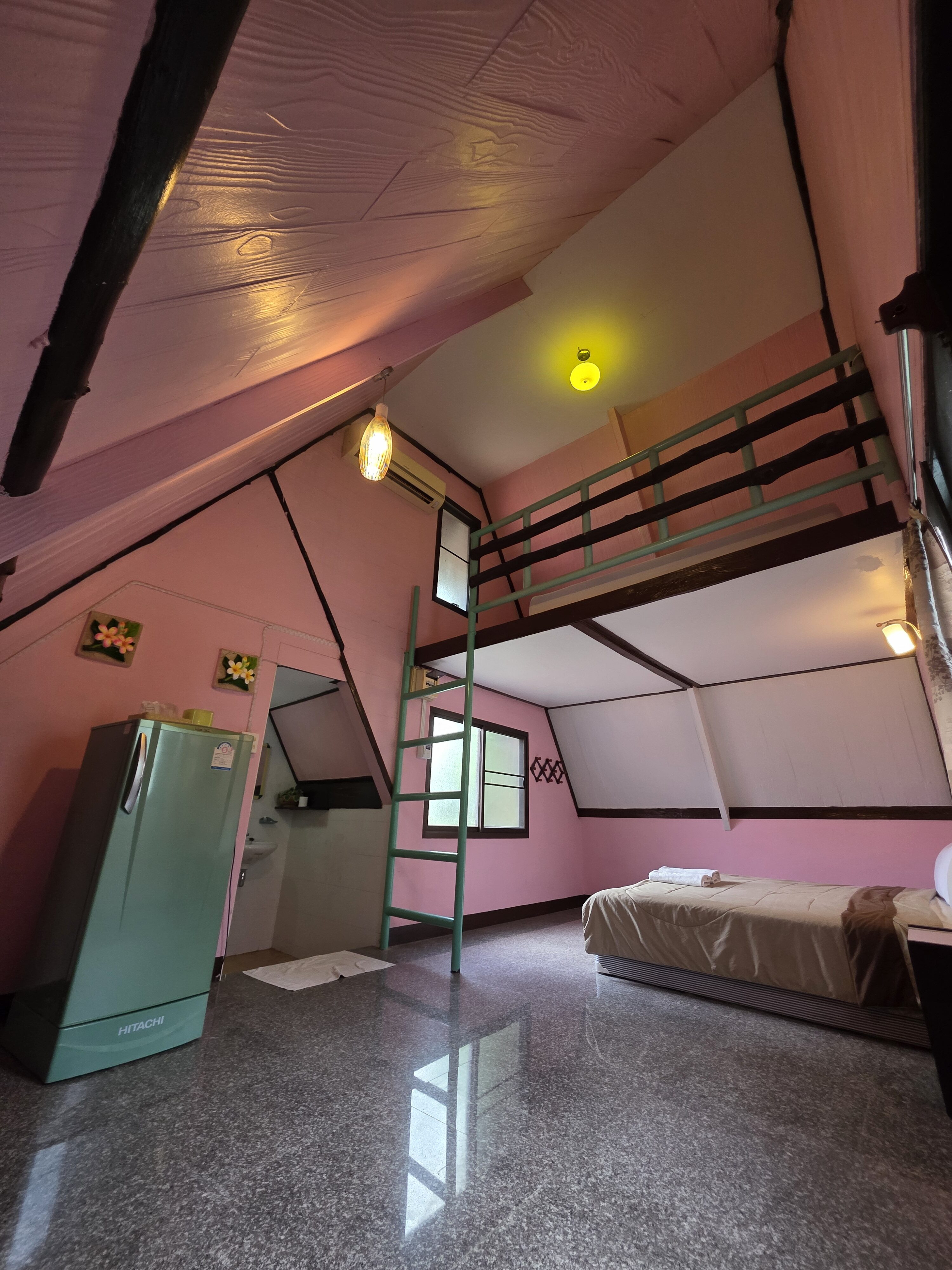 This main-level room offers a comfortable bed, a loft space ideal for sleeping or storage, a private bathroom with a refrigerator, and unique architectural details.